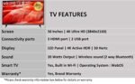 • Display: α5 Gen5 AI Processor 4K | 178 Degree Viewing Angle | 4K Upscaling | AI Brightness Control | Active HDR | HLG | HGIG Mode | ALLM | HDR 10 Pro